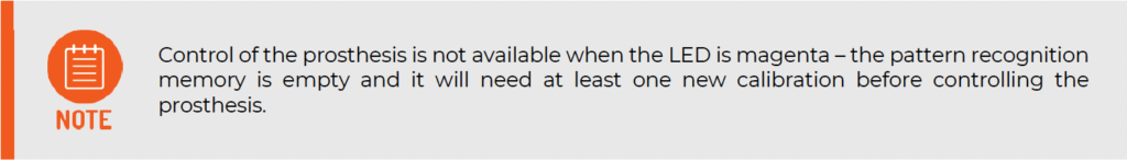 Hold the Coapt Complete Calibrate button for 10 seconds and release it once you hear the jingle. The button’s LED will turn magenta, indicating the blank pattern recognition memory starting state.